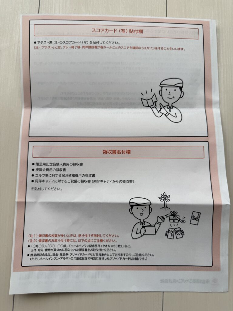 - 5. スコアカード貼り付け欄 ホールインワンを達成した日のスコアカードを貼り付けます。同伴者とホール毎の打数を確認して、サインをもらってください。 最近はカートナビへの入力が主流ですが、その場合はゴルフ場に言ってスコアを印刷してもらい、同伴者にサインをもらってください。競技会の場合はゴルフ場に記録のコピーをもらいます。 ⚠️ カートナビの印刷を忘れると面倒なことになるので、ここは十分注意してください!
