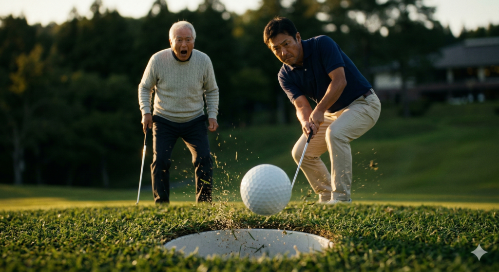 「強いか――!?」 誰もがそう思った瞬間。ボールはカップの奥の土手に激突し、ドンッ!と宙に跳ね上がった。 時間が止まったような空白のあと。